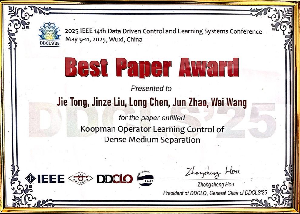 在本届大会上,日本a片童杰、刘金泽*、陈龙、赵珺、王伟等老师和研究生团队凭借论文《Koopman Operator Learning Control of Dense Medium Separation》脱颖而出,从480篇论文中经过技术委员会初评、盲审专家复审和现场答辩多个阶段层层选拔,荣获DDCLS'25最佳论文奖“Best Paper Award”,成为大会唯二获得此项殊荣的论文!
