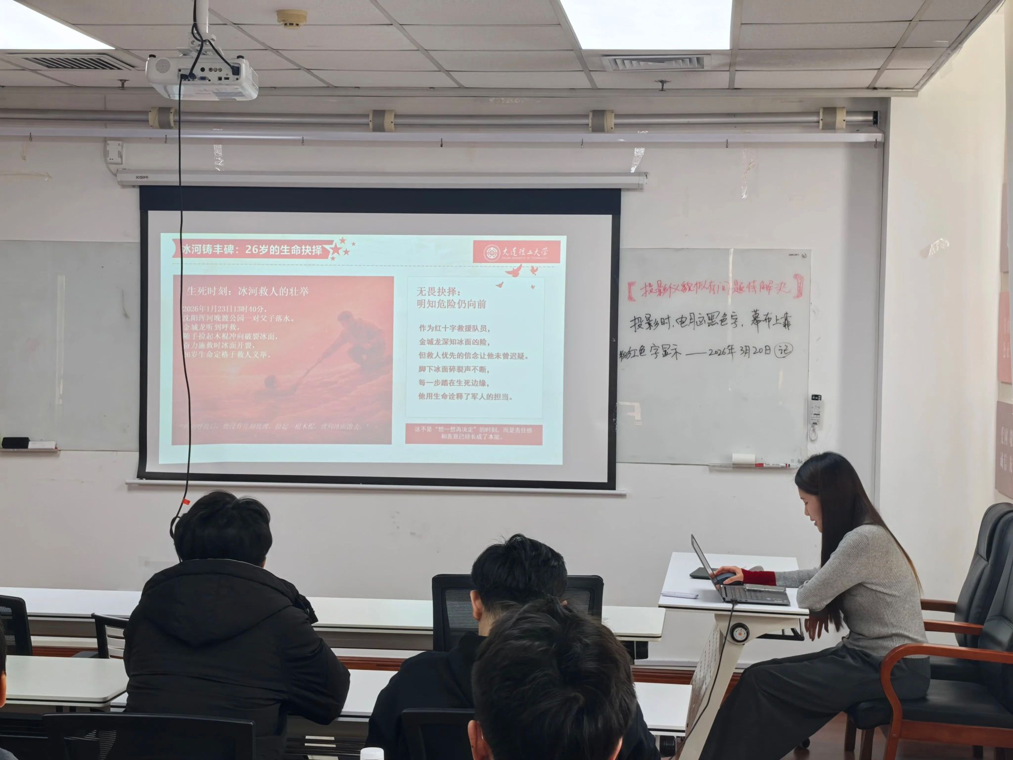 主讲人讲到,金城龙同志身上对党忠诚的政治品格、精益求精的敬业精神、无私忘我的奉献情怀、敢为人先的创新劲头、勇挑重担的担当本色,正是新时代雷锋精神的具象化体现,也让在场学子深刻认识到,雷锋精神从来不是抽象口号,而是融入一言一行的坚定坚守。